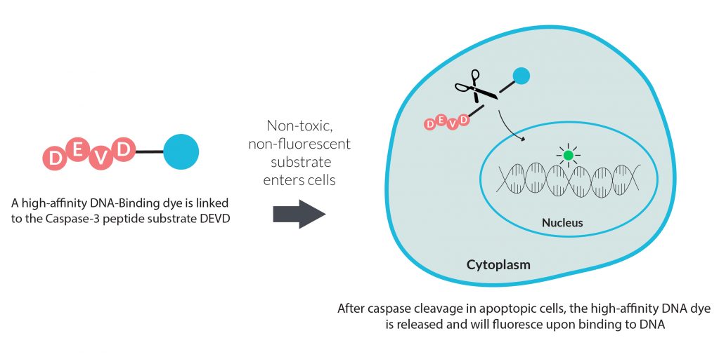 Principle of NucView® substrate technology. The substrate is non-fluorescent and does not bind DNA. After enzyme cleavage, the high-affinity DNA dye is released to bind DNA and becomes fluorescent.
