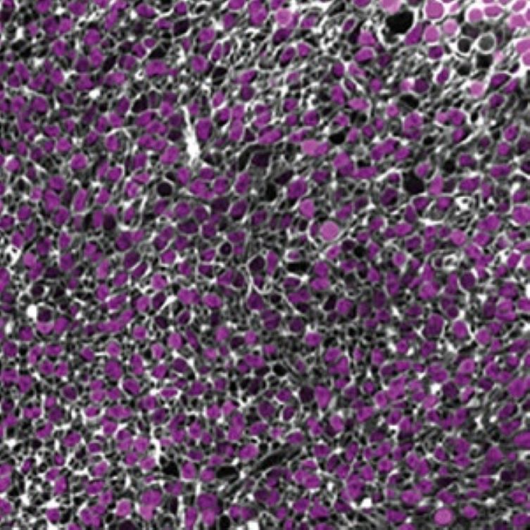 Confocal image of the center plane of the 3D stack of a 264 days old human retinal organoid without virus, stained with NucSpot Live 650 (magenta) and CellBrite Steady 550 (white). Credit: Rogler et al., Small Methods (2025). Reproduced under CC BY 4.0.