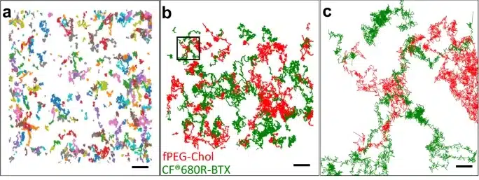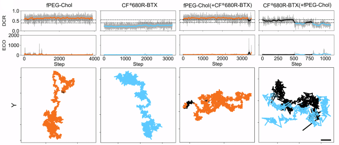 In a 2025 Nature Communications publication, Reina et al. applied two-color MINFLUX single-molecule tracking to visualize the joint motion of nAChRs and fluorescent cholesterol in live mammalian cells. To enable this approach, the authors used Biotium’s CF®640– and CF®680R-labeled α-bungarotoxin conjugates to selectively tag nAChRs. CF®680R Dye provided the critical spectral separation needed for multiplex detection of a cholesterol analogue labeled with STAR Red dye. This allowed the researchers to reliably co-track receptor and lipid molecules under single-wavelength excitation, revealing heterogeneous diffusion modes and direct instances of receptor–cholesterol co-diffusion.