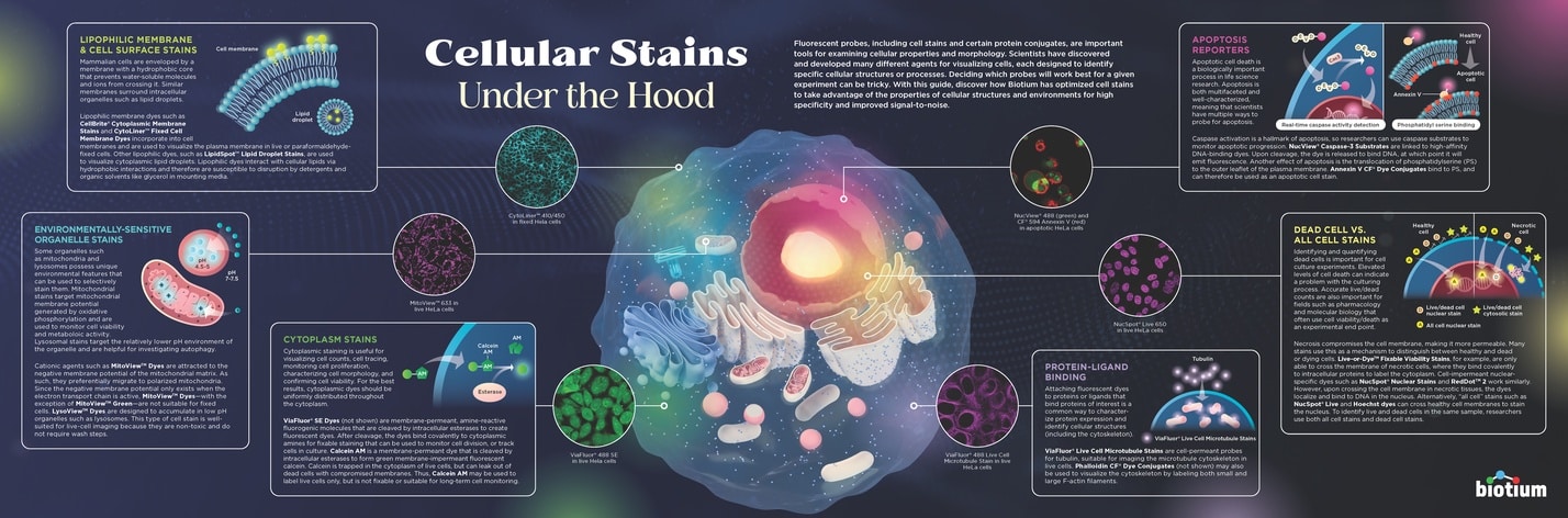 There are many different fluorescent probes, including cell stains and protein conjugates, to choose from when designing experiments to visualize cellular properties and morphology. Each of these probes are designed to identify specific cellular structures or processes. The experimental conditions under which these stains perform best varies, so having a clear understanding of their underlying mechanism can be key in deciding which probes will work best in a given experiment.