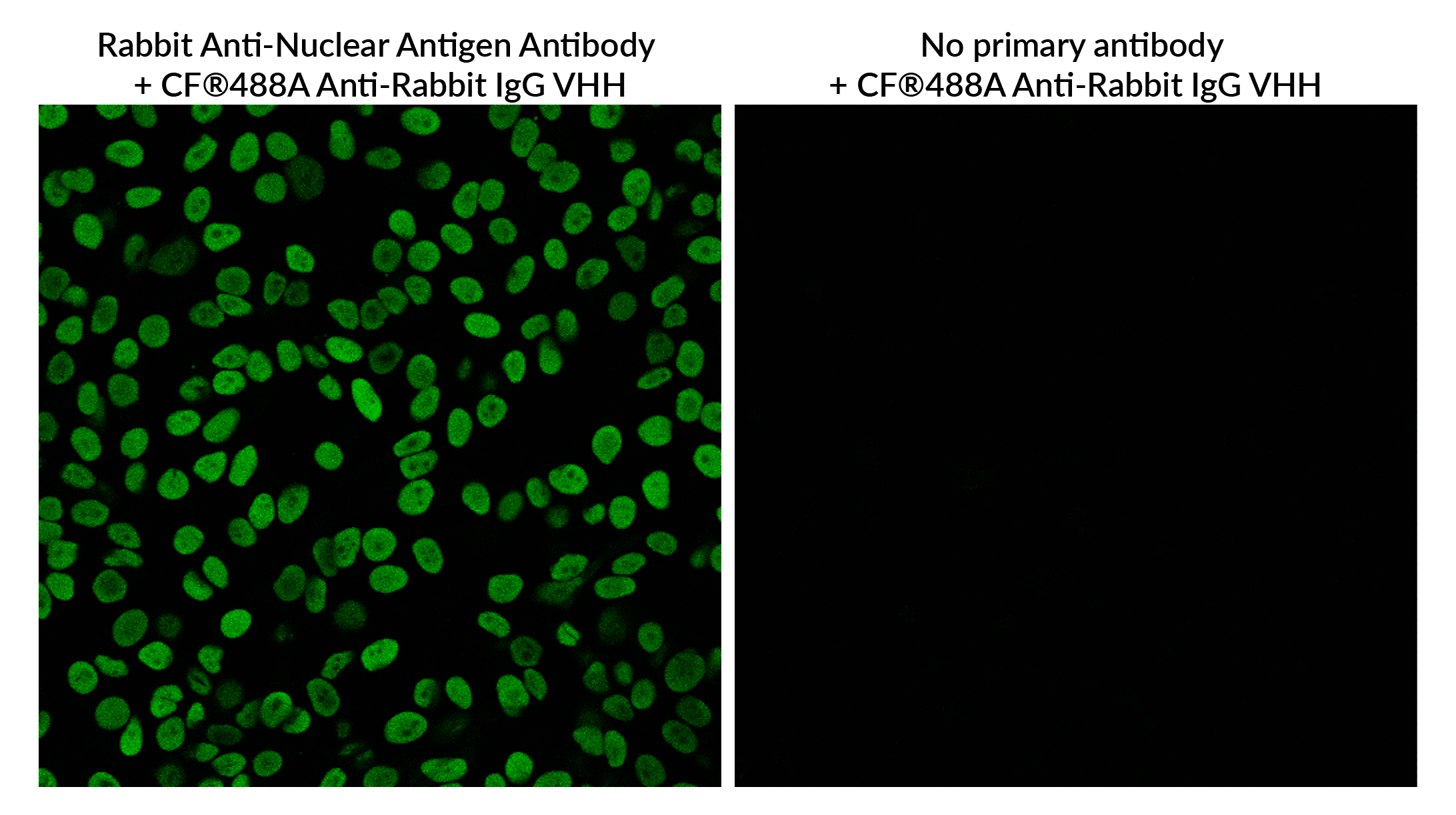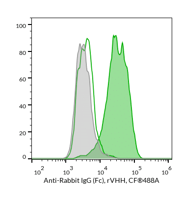 Alpaca Anti-Rabbit IgG (Fc), rVHH (N2507.RFC) is a secondary antibody that binds to the heavy chain (Fc region) of rabbit IgG. This high-affinity single-domain antibody (SdAb), also known as camelid VHH or Nanobody®, is part of our MiniMab™ series of highly optimized conjugated probes. The SdAb has been validated for immunofluorescence microscopy, flow cytometry, and western blot, and is available conjugated to CF® Dyes.