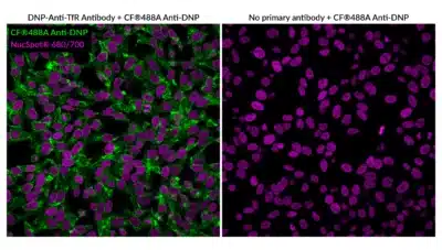 DNP Recombinant Monoclonal Rat Antibody (rLO-DNP-2) is a recombinant rat monoclonal antibody that recognizes the dinitrophenol (DNP) hapten for detection of DNP conjugated proteins and nucleic acids. This antibody belongs to the Biotium Choice list of select antibodies that have been validated and optimized in-house for fluorescence microscopy. The antibody is available conjugated to a selection of CF® Dyes. They are supplied in PBS, 2 mg/mL rBSA, and 0.05% sodium azide.