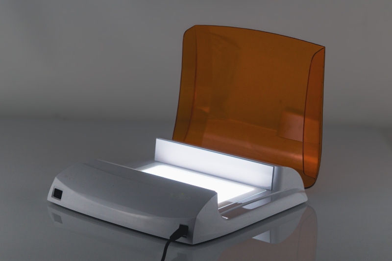We have tested a variety of different light sources for the development of DNAzure® bands in an agarose gel. We have found that most light sources will work, but how long the development takes is dependent on the brightness of the light. The fastest band development is seen with our Glo-Plate™ White Photoactivation Device and Glo-Plate™ 2.0 Blue LED Illuminator. We have also seen good results with other bright, white LED lights. Other light sources that work but take more time include an LED desk lamp and a cell phone light. We found that a 600W halogen lamp did not work well- it was too hot, which melted the gel.