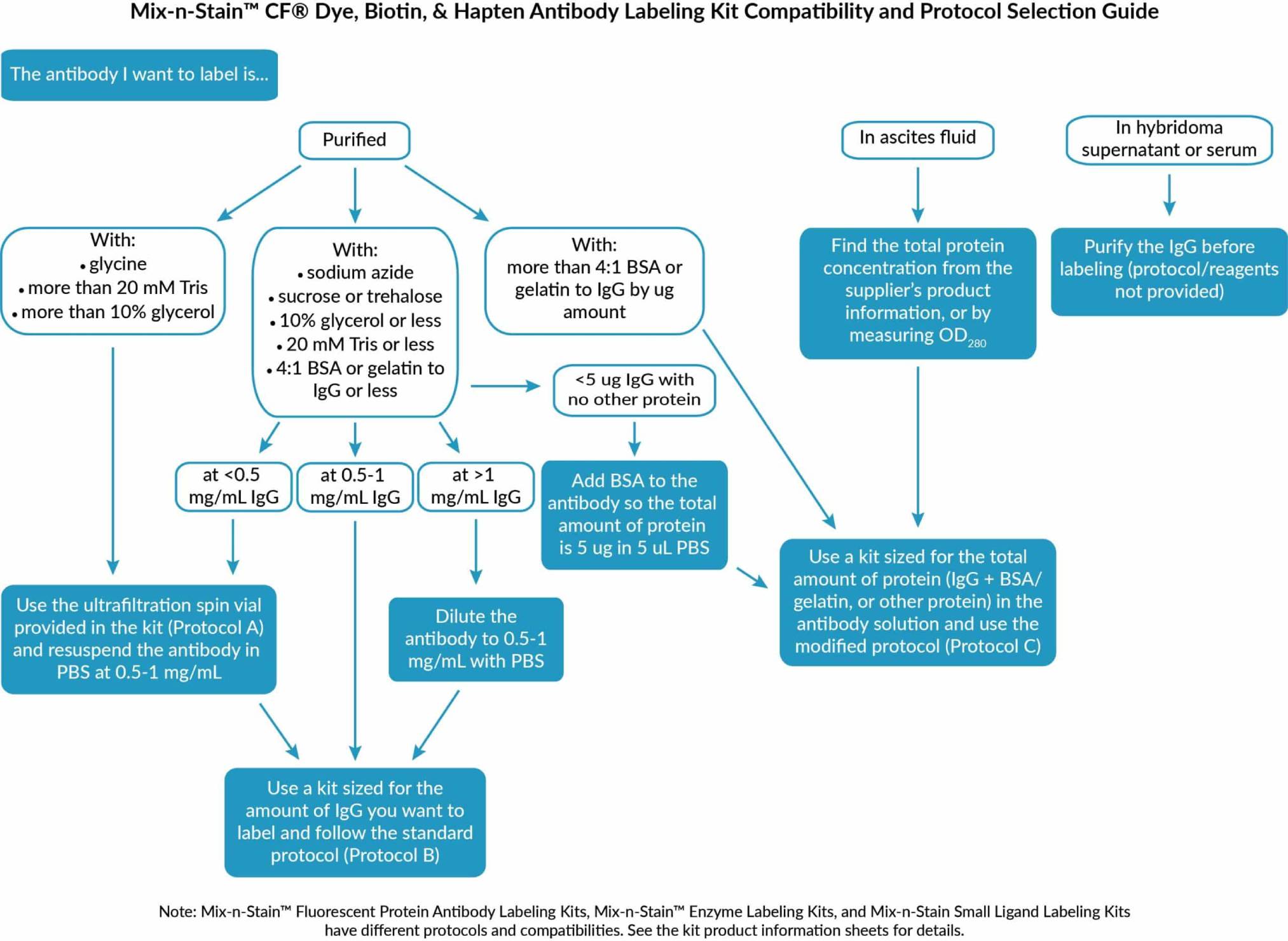 Mix-n-Stain™ Antibody Labeling Kits are very simple to use (see the workflow overview above). But before you begin, you must check that your antibody meets the compatibility requirements for labeling, and choose the right labeling protocol. Download the updated and expanded Product Protocol for a labeling check list to help you select the right kit size and labeling protocol for your antibody. Also see our Kit Compatibility and Protocol Selection Flowchart.