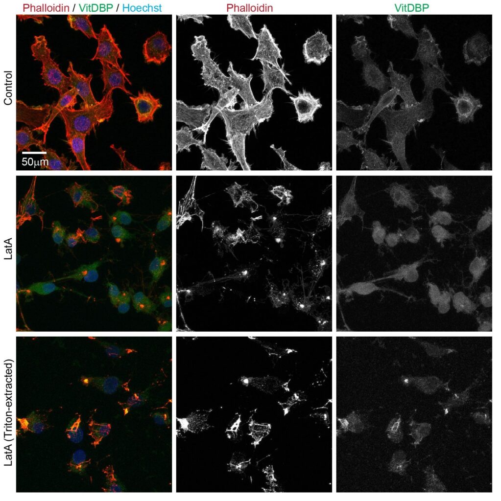 Vitamin D-BP staining may also be used in combination with fluorescent phalloidin staining of F-actin to visualize the distribution of unpolymerized G-actin relative to actin filaments. Vitamin D-BP is more specific for staining G-actin compared to fluorescent conjugates of DNase-I, which binds to DNA in addition to G-actin. Biotium’s Recombinant Human Vitamin D-BP Conjugates are labeled with a selection of our bright and photostable CF® Dyes for fluorescence microscopy.