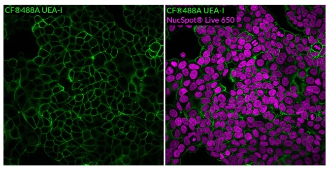 | CF® Dye Ulex Europaeus Agglutinin I (UEA I) | • Marker for human endothelial cells and incompletely differentiated gastrin cells • Binds to glycoproteins and glycolipids containing α-linked fucose residues • Choice of 5 CF® Dyes or biotin |