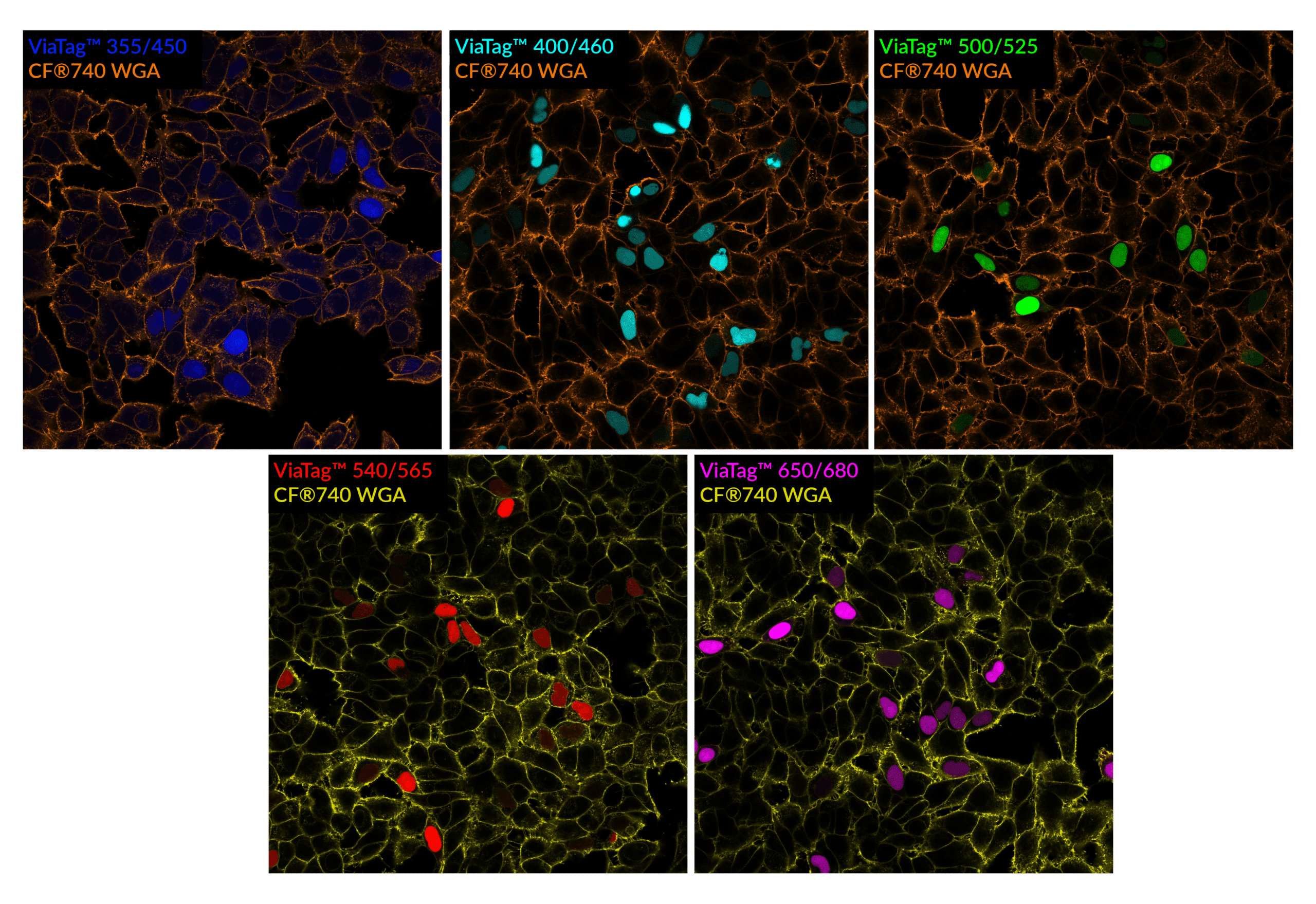 ViaTag™ Haloalkane Ligands are offered in a broad selection of fluorescent colors and supplied as stable, ready-to-use DMSO stock solutions. Labeling is rapid and efficient, producing bright signal without the extensive wash steps required by other HaloTag® ligands.