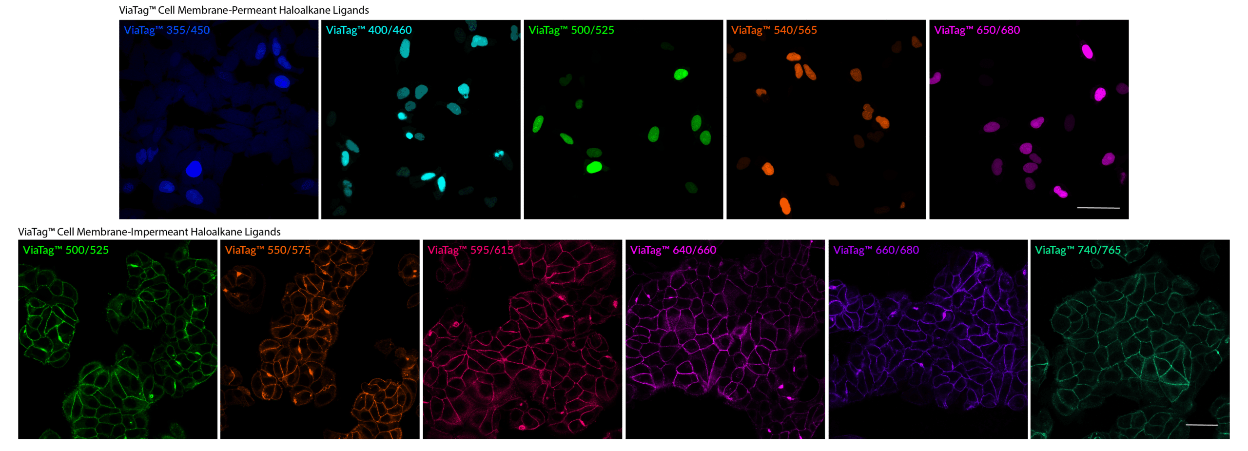 ViaTag™ Haloalkane Ligand staining. Top row: HeLa cells were transiently transfected with NLS3-HaloTag® expression vector targeting HaloTag® to the cell nucleus. Transfected cells were fixed with PFA, then stained with ViaTag™ cell membrane-permeant ligands. Bottom row: PFA-fixed MCF7 cells stained with mouse anti-CD9 recombinant antibody (clone 2310.9) and anti-mouse SdAb-HaloTag® fusion, then stained with ViaTag™ cell membrane-impermeant ligands. Scale bars: 50 um.