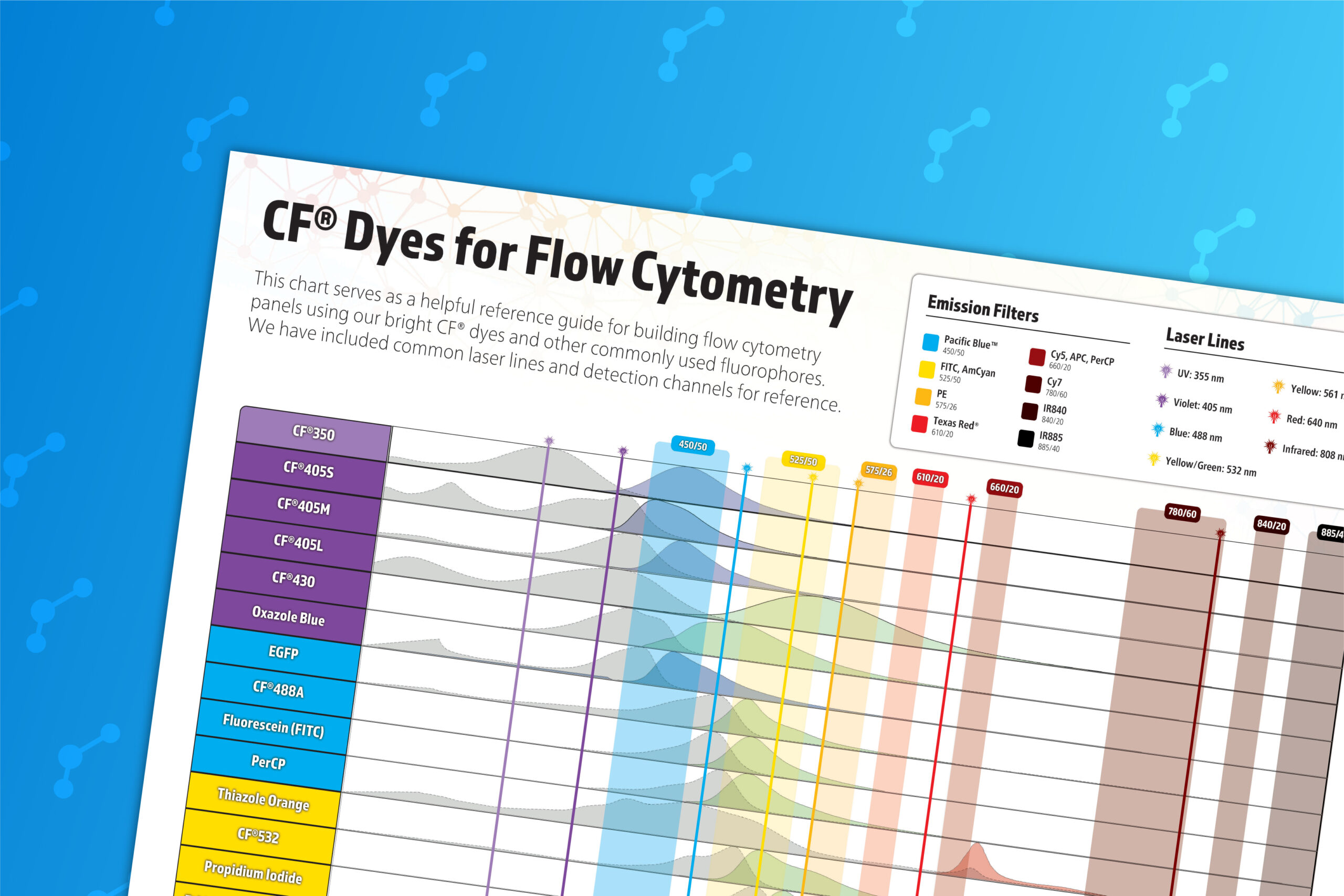 This poster is a helpful reference guide for building flow cytometry panels using our bright CF® Dyes and other commonly used fluorophores. The poster includes laser excitations and emission filter sets of typical flow cytometry instrument configurations to choose fluorophores for each laser excitation and filter emission range. Poster dimensions are 24 x 18 inches (L x W).