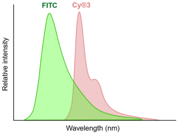 Figure 1. Example of spectral overlap that can lead to cross-talk. The FITC and Cy®3 emission peaks are well separated, but there is still an overlapping area that presents a potential for cross-talk. Created in https://BioRender.com