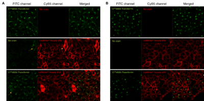 Figure 2. Unbalanced fluorophore signal intensities lead to cross-talk during simultaneous excitement. Live HeLa cells were labeled with CF®488A-transferrin receptor (TfR; green) and CellBrite® Steady 650 (red), then imaged with the 488 nm and 639 nm lasers simultaneously. (A) CF®488A-TfR produces a dim signal, requiring increased detector sensitivity in the FITC channel. Under these conditions, the much brighter CellBrite® Steady 650 signal bleeds into the FITC channel. Areas of colocalization (yellow in merged image) may be artifacts of bleed-through. (B) After titration to balance signal intensities, CF®488A-TfR and CellBrite® Steady 650 are cleanly detected in their respective channels with minimal cross-talk, enabling more confident assessment of colocalization.