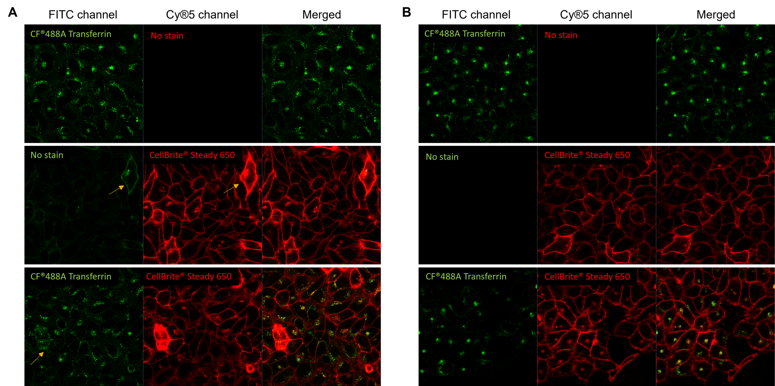 Figure 2. Unbalanced fluorophore signal intensities lead to cross-talk during simultaneous excitement. Live HeLa cells were labeled with CF®488A-transferrin receptor (TfR; green) and CellBrite® Steady 650 (red), then imaged with the 488 nm and 639 nm lasers simultaneously. (A) CF®488A-TfR produces a dim signal, requiring increased detector sensitivity in the FITC channel. Under these conditions, the much brighter CellBrite® Steady 650 signal bleeds into the FITC channel. Areas of colocalization (yellow in merged image) may be artifacts of bleed-through. (B) After titration to balance signal intensities, CF®488A-TfR and CellBrite® Steady 650 are cleanly detected in their respective channels with minimal cross-talk, enabling more confident assessment of colocalization.