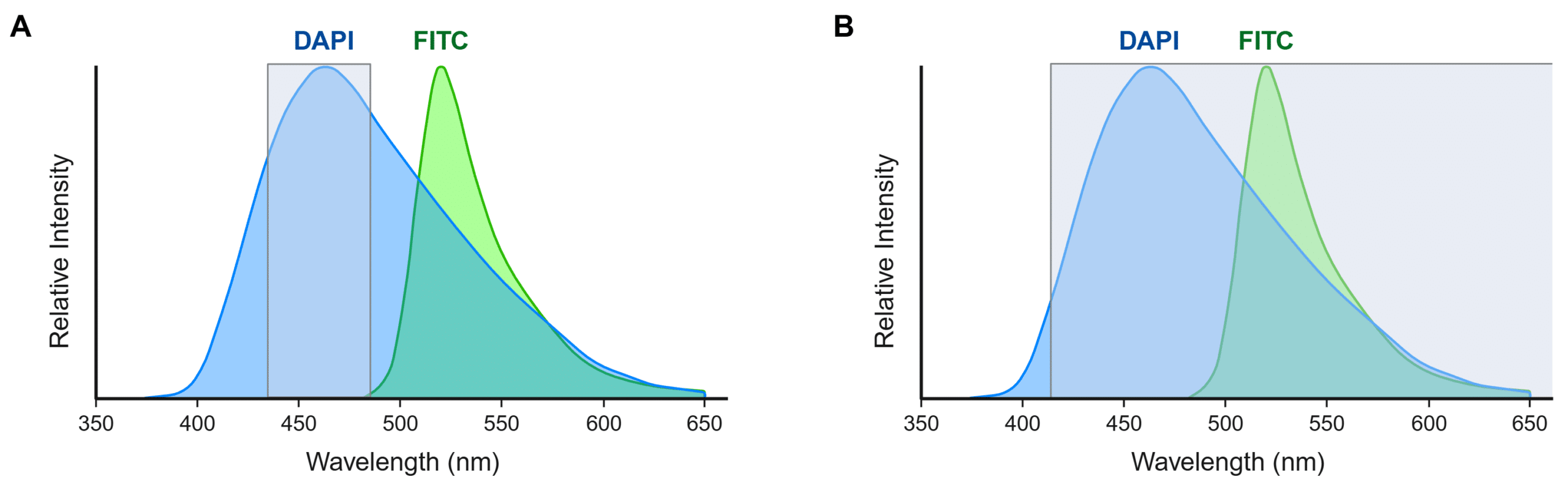Figure 3. Effect of emission filter selection on spectral overlap in multiplex fluorescence imaging. Emission spectra of DAPI (blue) and FITC (green) are shown with wavelengths that will be detected with a 460/50 bandpass filter (A) or a 415 longpass filter (B) overlaid (gray). (A) A 460/50 bandpass filter will restrict detection to DAPI emission wavelengths and avoid cross-talk. (B) A 415 longpass filter will capture emission wavelengths from both DAPI and FITC. Created in https://BioRender.com
