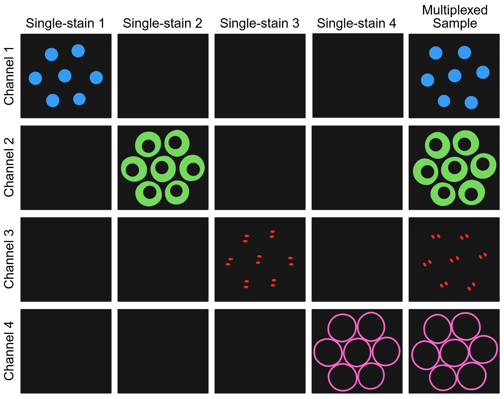 Figure 4. Sample and channel matrix illustrating how single-stain controls should only show signal in the on-target channel while multiplexed samples should only show specific signal in each on-target channel. Created in https://BioRender.com