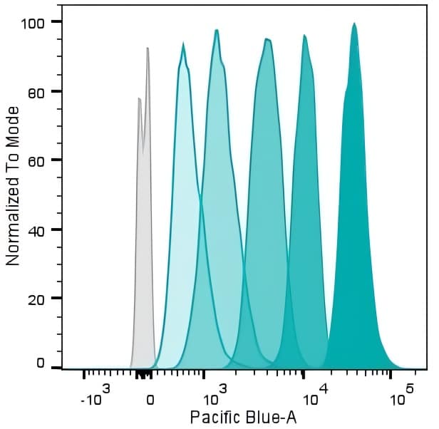 Cell proliferation dyes like ViaFluor® SE were developed to monitor cell division by flow cytometry. Immediately after staining cells with the dye, a single, bright fluorescent population is detected. With each cell division, daughter cells inherit roughly half of the fluorescent label, resulting in the appearance of a successively dimmer peak on a flow cytometry histogram for each cell division. Thus, flow analysis can be used to count multiple divisions of cells grown in culture or injected in vivo after labeling with the proliferation dye. ViaFluor® SE dyes are bright, highly reactive, and have low toxicity, features that are critical for cell division tracking.