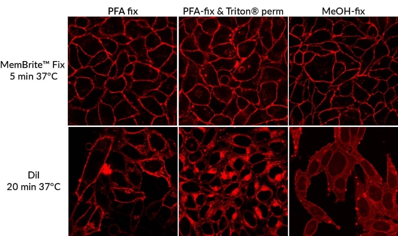 Due to their high water solubility, CellBrite® Fix and MemBrite® Fix dyes yield much more uniform fluorescent staining than lipophilic dyes like DiO and DiI. They are non-cytotoxic and do not readily transfer between cells, and also stain yeast and bacteria. Surface staining is well-retained after permeabilization or methanol fixation, with only a slight increase in intracellular fluorescence.