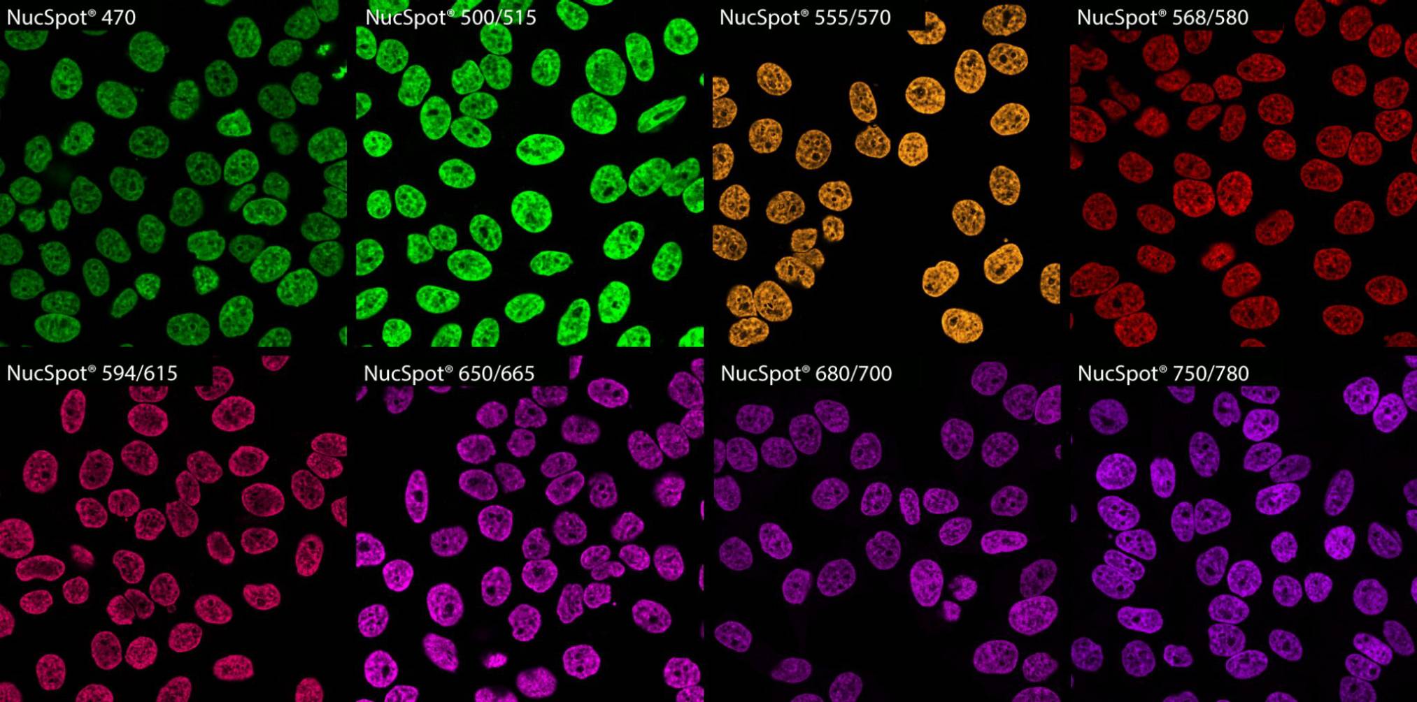 NucSpot® Nuclear Stains are cell membrane-impermeant fluorescent DNA stains available in a variety of colors from green to near-infrared (near-IR). NucSpot® Stains have minimal fluorescence until they bind to DNA and can be used for no-wash nuclear staining.