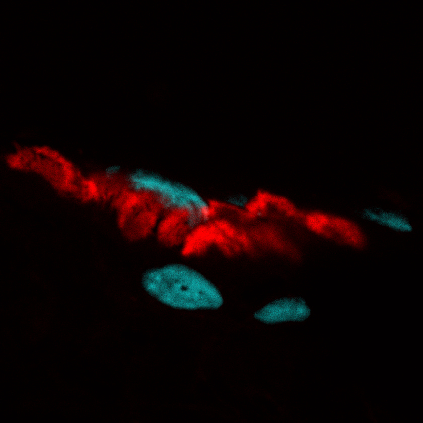 RedDot™2 is membrane impermeant and can be used as a selective dead cell stain, or as a nuclear counterstain for fixed cells. RedDot™2 shows better nuclear specificity in fixed cells than DRAQ7™, which requires a blocking step for nuclear-specific counterstaining. RedDot™2 has also been validated for tissue clearing protocols such as CUBIC.