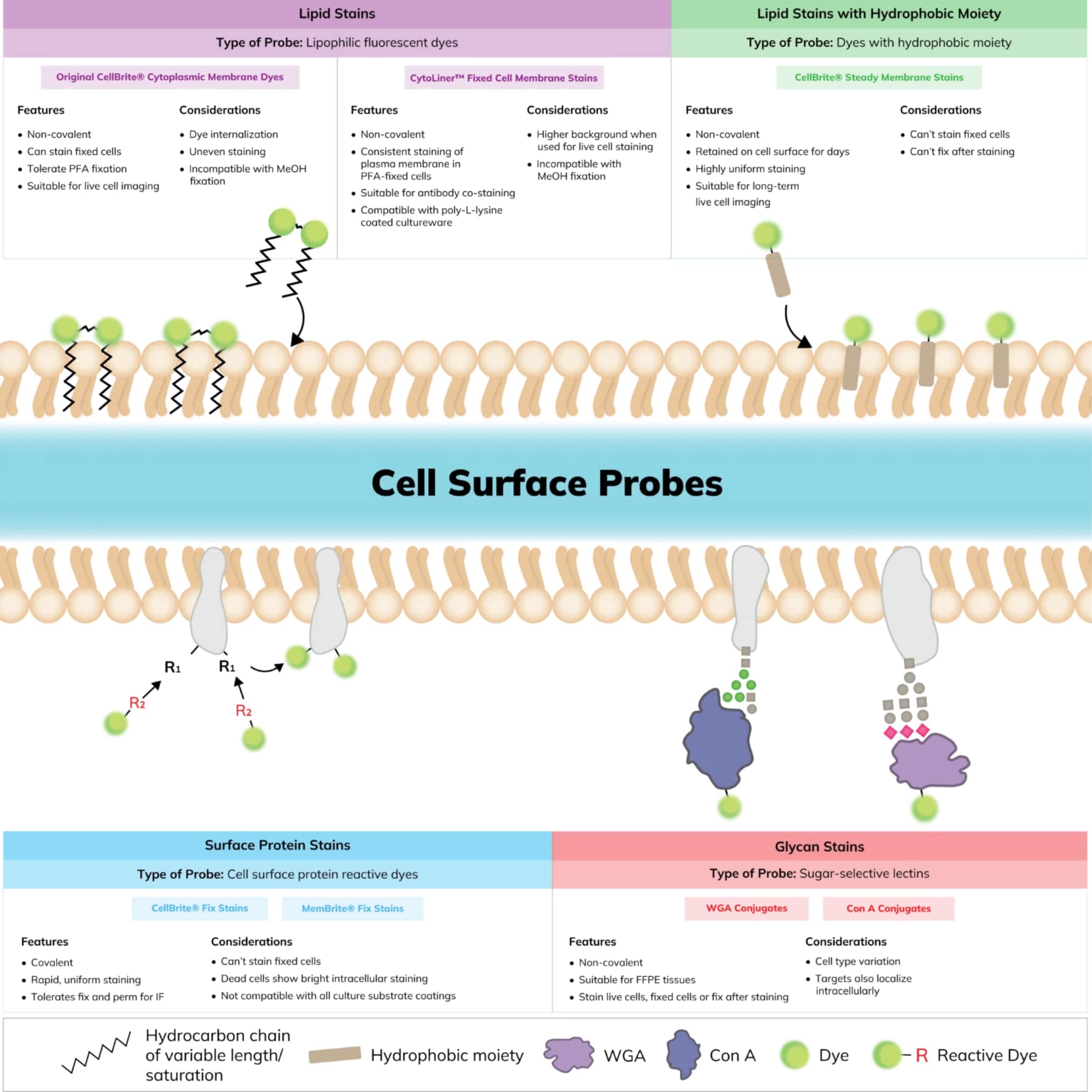 | CellBrite® Steady Membrane Staining Kits | Yes | Yes | No | No | No | No | No | 5 colors (blue to NIR) | Pro: Image live cell surface for days Pro: Enhancer masks intracellular staining Pro: Fast, even staining in medium Con: Does not tolerate fixation |