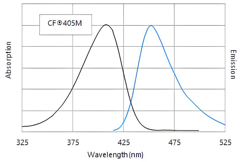 Figure 1. Normalized absorption and emission spectra of CF®405M goat anti-mouse IgG conjugate in PBS.