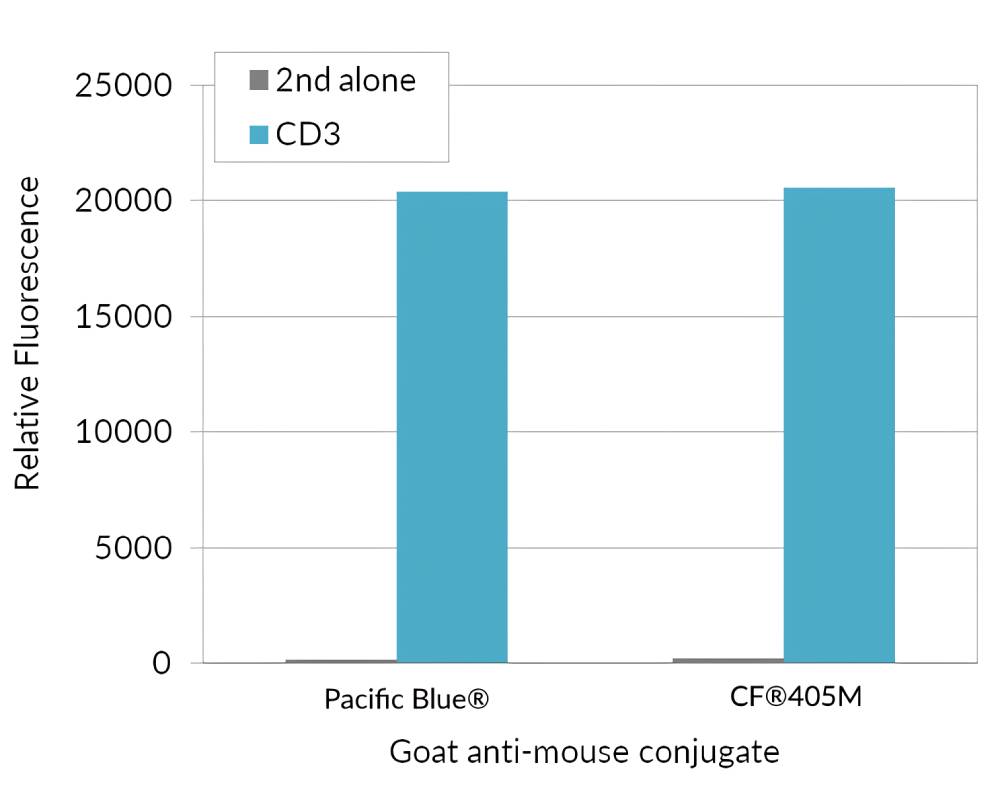 Figure 2. CF®405M is as bright as Pacific Blue™ in flow cytometry. Jurkat cells were stained with intracellular CD3 followed by CF®405M or Pacific Blue™ goat an... See More