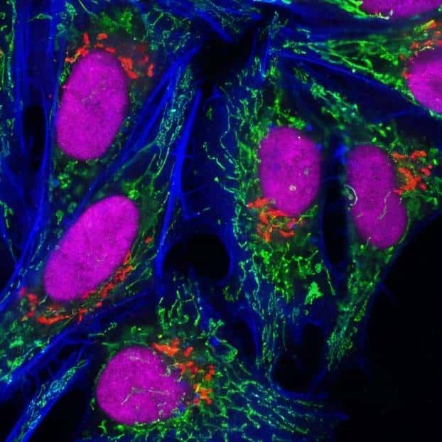 Figure 6. HeLa cells stained with rabbit anti-COXIV + CF®488A goat anti-rabbit (mitochondria, green), mouse anti-Golgin 97 + CF®555 goat anti-mouse (Golgi, red)... See More
