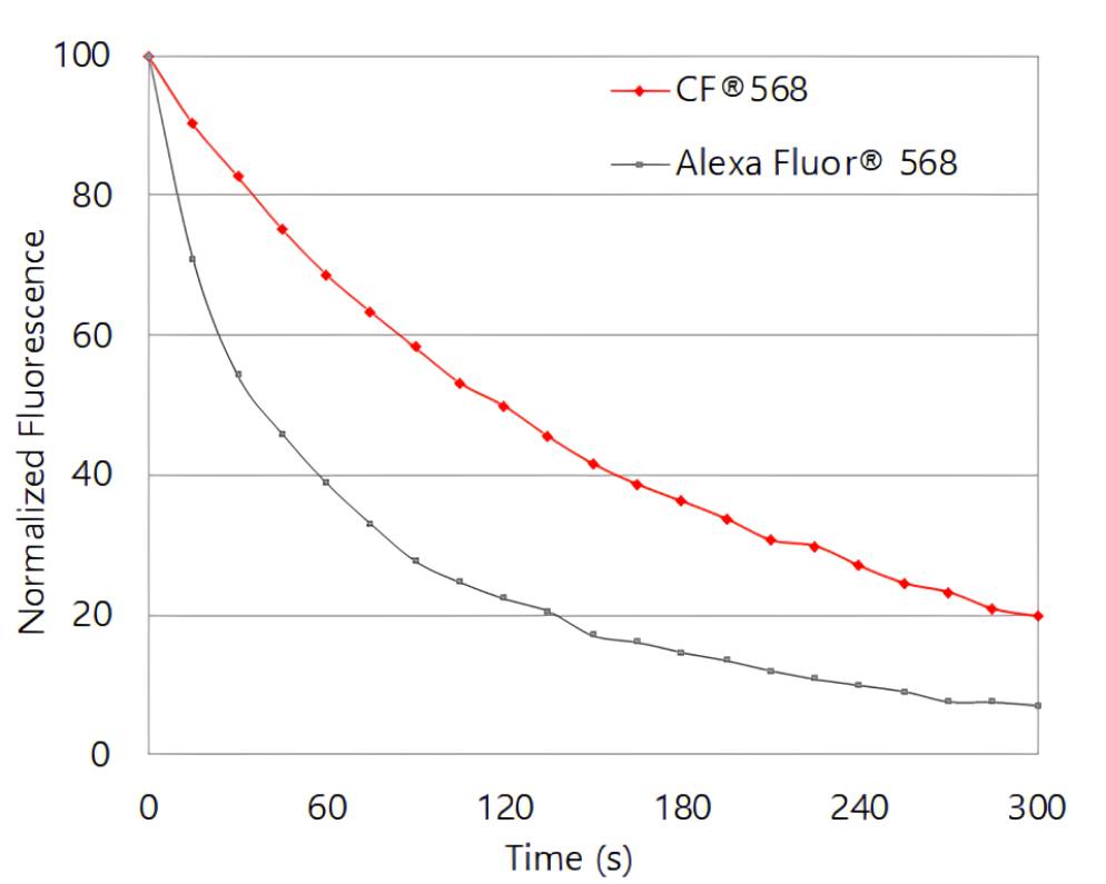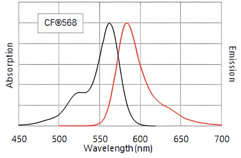 CF®568 is a red fluorescent dye with excitation optimally matching the 568 nm laser line. Its antibody conjugates are significantly brighter and more photostable than Alexa Fluor® 568, making it ideal for confocal and single molecule imaging. CF®568 has been validated for super-resolution techniques including SIM, TIRF, STED, and multicolor STORM, and produces better STORM images than Cy®3b (learn more about CF® Dyes for Super-Resolution Imaging).