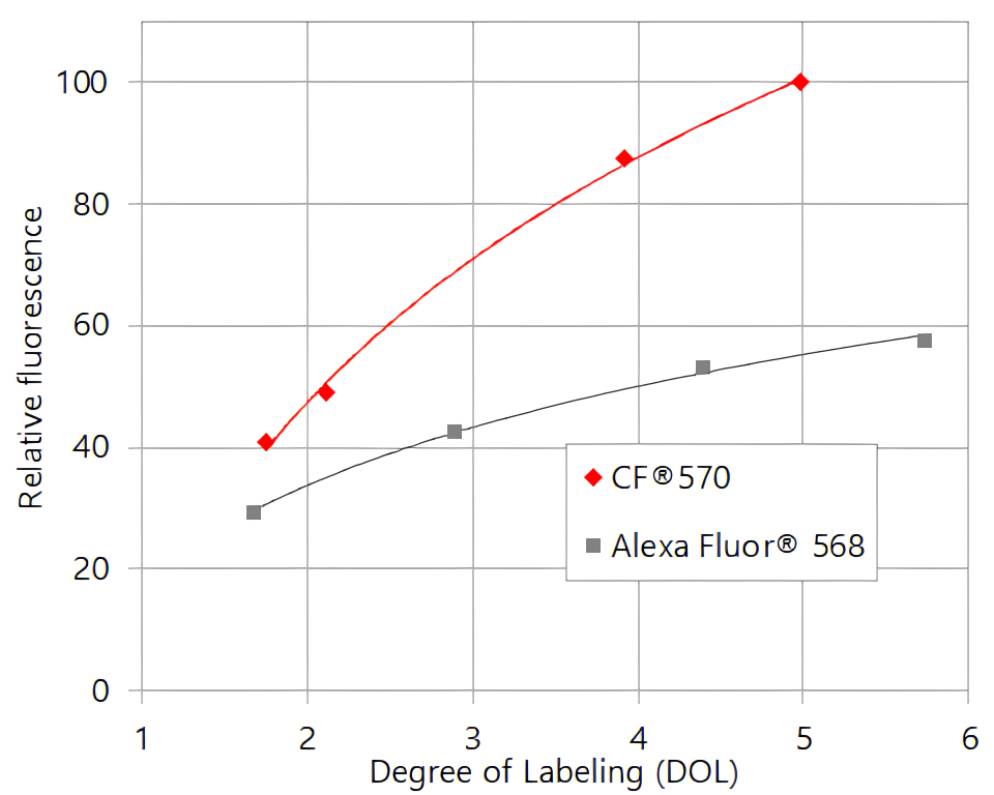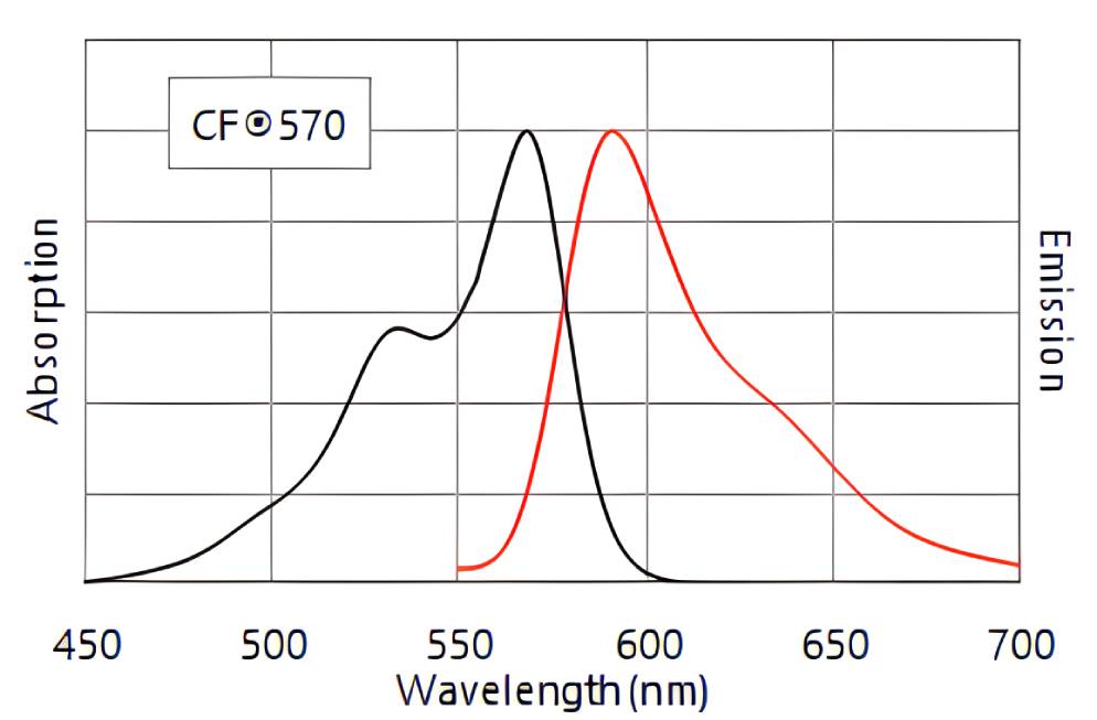 CF®570 is a red fluorescent dye with exceptional brightness. CF®570 produces antibody conjugates with brighter fluorescence compared to spectrally similar dyes (Figures 2). We offer amine-reactive and thiol-reactive forms of CF®570.