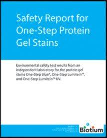 | One-Step Blue® | 21003 | Protein Gel Stains | 100% Water-based formulation No need for acetic acid, methanol, microwaving, washing or fixing Certified under CCR Title 22 as non-toxic Suitable for drain disposal after a simple pH neutralization step |