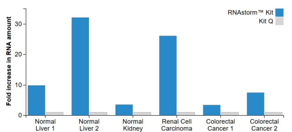 The CAT5™ catalytic technology in the CELLDATA RNAstorm™ 2.0 FFPE RNA Extraction Kit yields more amplifiable RNA for better RT-PCR, microarray, and NGS results. The superior quality of RNAstorm™-derived RNA has been demonstrated by a higher RIN score, higher yield, higher DV200—identified by an Illumina tech note as the best predictor of RNA-seq success—plus improved alignment. Get more from your FFPE samples.