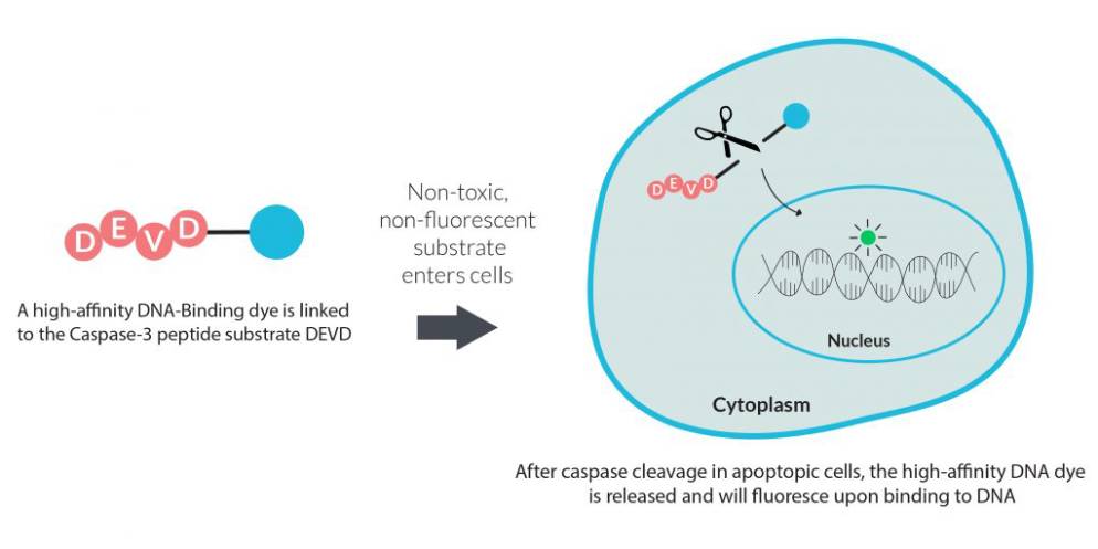 NucView® Caspase-3 Substrates are novel fluorogenic substrates to detect apoptosis in intact cells in real-time. The NucView® caspase-3/7 substrate peptide DEVD is attached to a fluorogenic DNA-binding dye. Before cleavage, the dye is non-fluorescent and unable to bind to DNA. The substrate enters the cell cytoplasm where it is cleaved by caspase-3/7 in apoptotic cells to release the fluorogenic DNA dye, which stains the nucleus. NucView® can be fixed with formaldehyde after staining, but it cannot be used to stain fixed cells or tissues.
