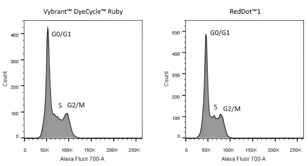 RedDot™1 is a far-red, cell membrane-impermeant, nuclear stain. This live cell stain is similar to DRAQ®5 and can be used for cell cycle analysis by flow cytometry. Also, RedDot™1 cell cycle analysis does not require an RNase step, unlike the classic nuclear stain Propidium Iodide (PI). RedDot™1 can be used as a far-red nuclear counterstain for live cells in microscopy. The dye is highly thermostable and photostable, for convenient handling.