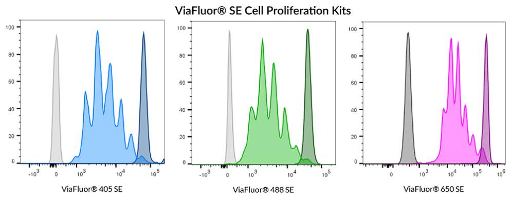 ViaFluor® SE Cell Proliferation Kits were developed to provide superior cell staining, fixability, and low toxicity. ViaFluor® 405 gives great peaks with no toxicity and behaves identically to CellTrace™ Violet. ViaFluor® 488 and ViaFluor® CFSE are both detected in the FITC channel, but ViaFluor® 488 is a less toxic, less leaky, and more fixable alternative to the classic dye CFSE. It also has less bleed-through into other channels such as PE and PE-Texas-Red®. ViaFluor® 650 was designed as an improved and cost-effective alternative to CellTrace™ Far Red for monitoring cell proliferation in the APC channel.