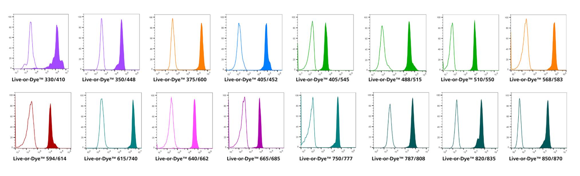 Live-or-Dye™ stains are available in two sampler kits, each containing five different dye colors, for excitation from all of the popular flow cytometry laser lines (see Live-or-Dye™ Sampler Kits table below). The Live-or-Dye™ Sampler Kit, Standard (32016) was designed for use on the most common flow cytometer laser and filter configurations, with dyes excitable by UV, Violet, Blue, Yellow-Green, and Red lasers. The Live-or-Dye™ Sampler Kit, Spectral (32017) was designed for use in spectral scanning flow cytometry. It contains dyes excitable by UV, Violet, Blue, and Red lasers, all of which have been validated on the Cytek® Aurora spectral cytometer, and chosen for their ability to fill the gaps in many spectral flow panels.