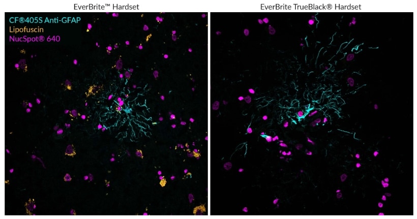 Lipofuscin are autofluorescent granules that are a common source of background that make fluorescence imaging virtually impossible in human and aged animal tissues such as brain and retina. EverBrite TrueBlack® Hardset Mounting Medium is the only mounting medium optimally formulated for quenching lipofuscin fluorescence while offering the same protection against photobleaching as our original EverBrite™ Hardset. The mounting medium is available without nuclear stain, with DAPI, or with NucSpot® 640 nuclear counterstains.