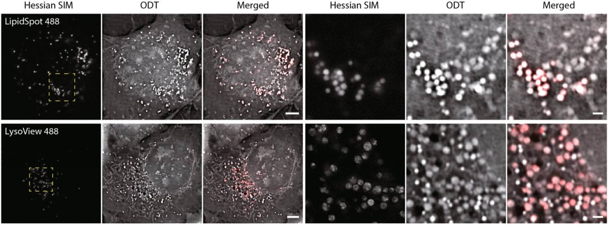 Highlighted Citation: In a publication in Light: Science & Applications, Dong et al. developed a dual-mode high-speed super-resolution microscope for live cells by combining optical diffraction tomography (ODT) with structured illumination microscopy (SIM). This novel technique, deemed super-resolution fluorescence assisted diffraction computational tomography (SR-FACT), was used to acquire ~100 nm resolution images merged with 3D imaging of live cells in real time. The authors validated the technique by visualizing organelles within COS-7 cells labeled by expressed GFP fusion proteins or synthetic fluorescent probes. SIM visualization of LysoView™ 488 and LipidSpot™ 488 were shown to colocalize in the ODT channel with lysosomes and lipid droplets respectively.