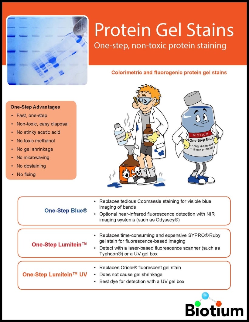 One-Step protein gel stains are fast, low-cost, and easy to use; no fixing, washing, or microwaving needed. Stain in as little as 5 minutes with a 100% water-based, non-toxic formula (no acetic acid or methanol). Safe for drain disposal after pH neutralization. Compatible with Edman sequencing and mass spectrometry. Download the Safety Report for more info.