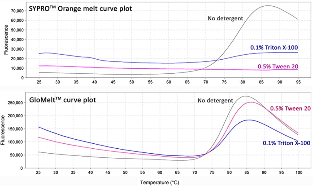 GloMelt™ tolerates common stabilizers and destabilizers, and unlike SYPRO® Orange, it performs well in the presence of detergents. GloMelt™ also has excellent water solubility, allowing storage of diluted dye solutions.