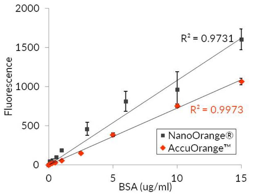 | AccuOrange™ | 0.1-15 ug/mL | Fluorescence-based (480/598 nm) Highly linear Signal stable for at least 16 hours Compatible with reducing agents Not compatible with detergents |