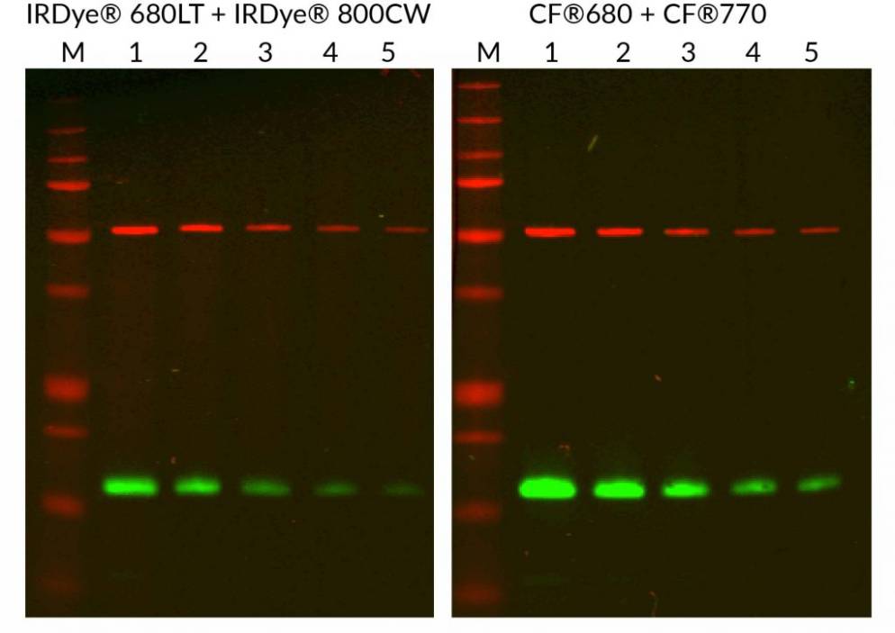 Near-infrared (near-IR) western detection is highly sensitive, and offers advantages of wider linear range and multiplexing capability compared to chemiluminescence detection. Biotium’s near-IR CF® Dyes are the brightest and most photostable available. Learn more about CF®680 and CF®770 dyes for near-IR western, In Cell Western®, and other applications.