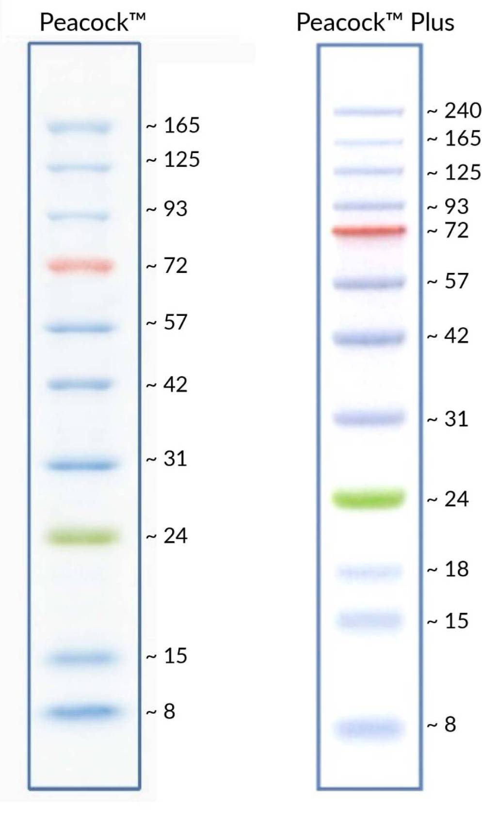 | Peacock™ Plus Prestained Protein Marker | 21531 | 50 uL or 500 uL | • Visible color protein marker for SDS-PAGE and western • 10 blue bands ranging from 8 kDa to 245 kDa • Red/green bands at 75 kDa/25 kDa |