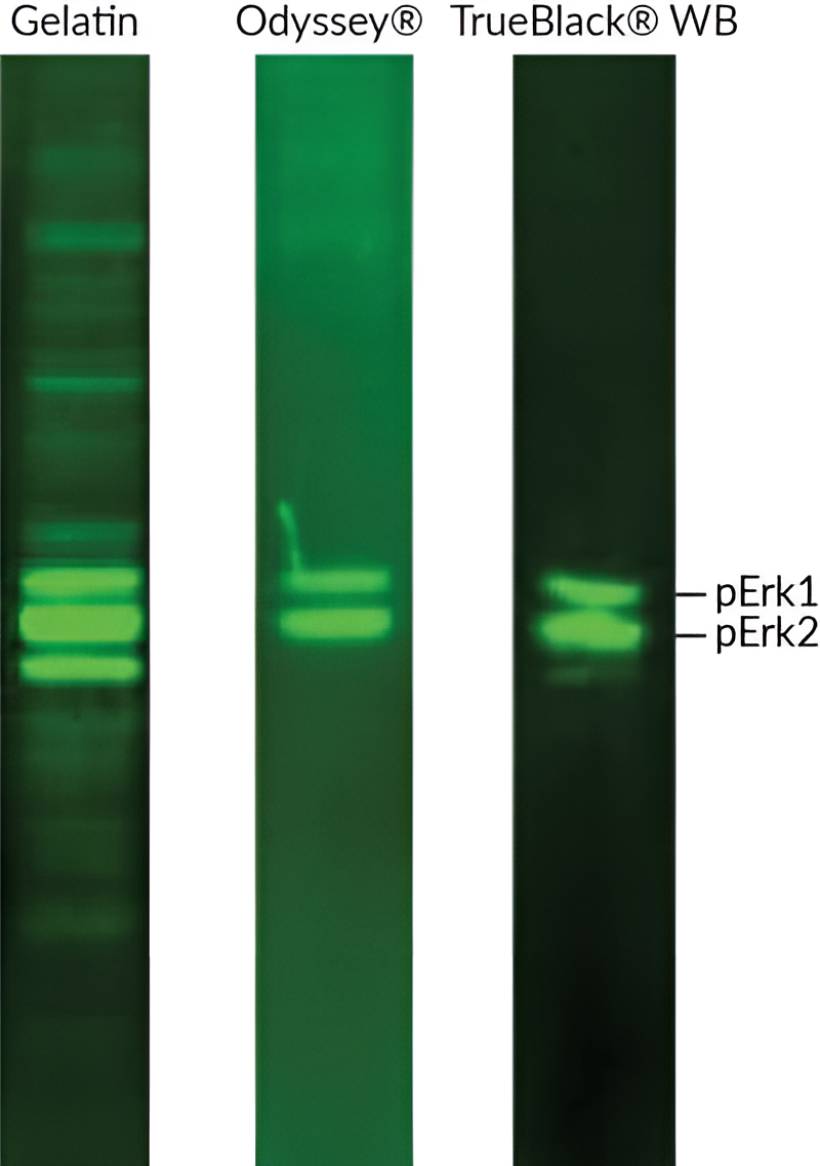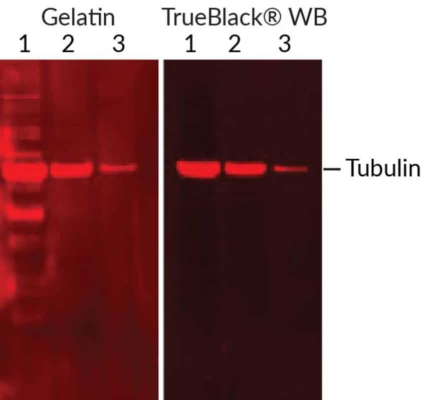 Non-specific signal in WB can arise from antibody cross-reactivity, non-specific adsorption, and membrane autofluorescence. Also, fluorescent dyes often carry multiple negative charges to improve dye solubility and brightness, which can result in non-specific binding. The TrueBlack® WB blocks background from multiple sources, including charged dye conjugates, and is especially advantageous for phosphoprotein detection.