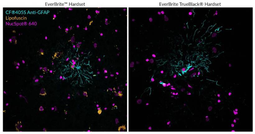 Lipofuscin are autofluorescent granules that are a common source of background that make fluorescence imaging virtually impossible in human and aged animal tissues, such as brain and retina. EverBrite TrueBlack® Hardset Mounting Medium is the only mounting medium optimally formulated for quenching lipofuscin fluorescence while offering the same protection against photobleaching as our original EverBrite™ Hardset. The mounting medium is available without nuclear stain, with DAPI, or with NucSpot® 640 nuclear counterstains.