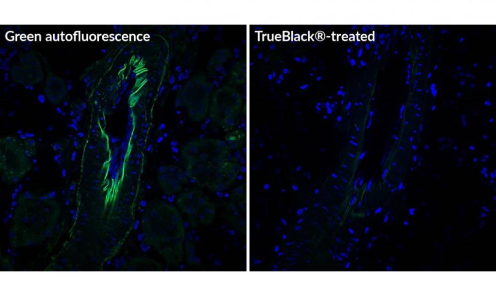 TrueBlack® eliminates lipofuscin autofluorescence in tissues, and also can reduce autofluorescence from other sources, such as collagen, elastin, and red blood cells. It is not as effective at quenching these sources of autofluorescence as it is for lipofuscin, but it can improve background. It also has been used to quench fluorescence on polycarbonate filters used as cell supports (Futia et al. 2016). Download a list of TrueBlack® references.