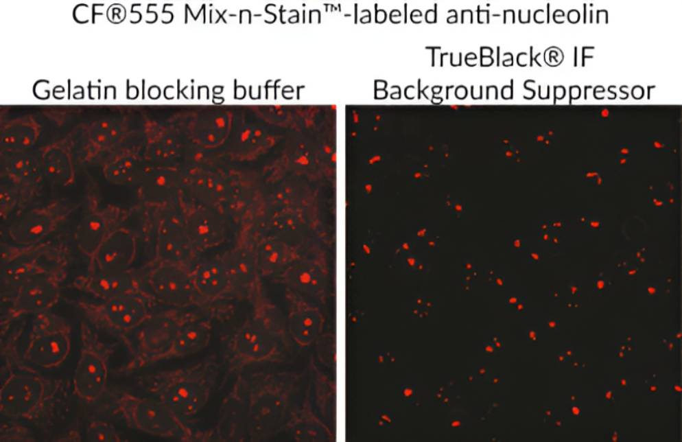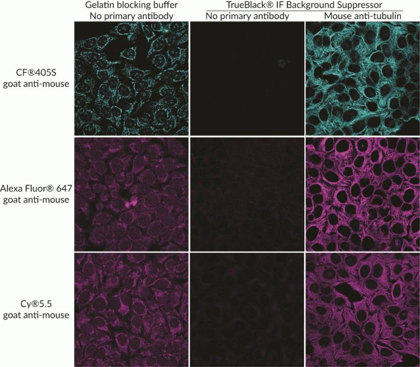 TrueBlack® Background Suppressor includes reagents for blocking both non-specific protein binding as well as background from charged dyes. Examples of charged dyes that show improved signal to noise with the Background Suppressor are CF®405S, CF®405M, CF®555, Alexa Fluor® 647, and Cy®5.5. One-step blocking and permeabilization takes only 10 minutes, and the buffers contain no mammalian proteins, for broad antibody compatibility.