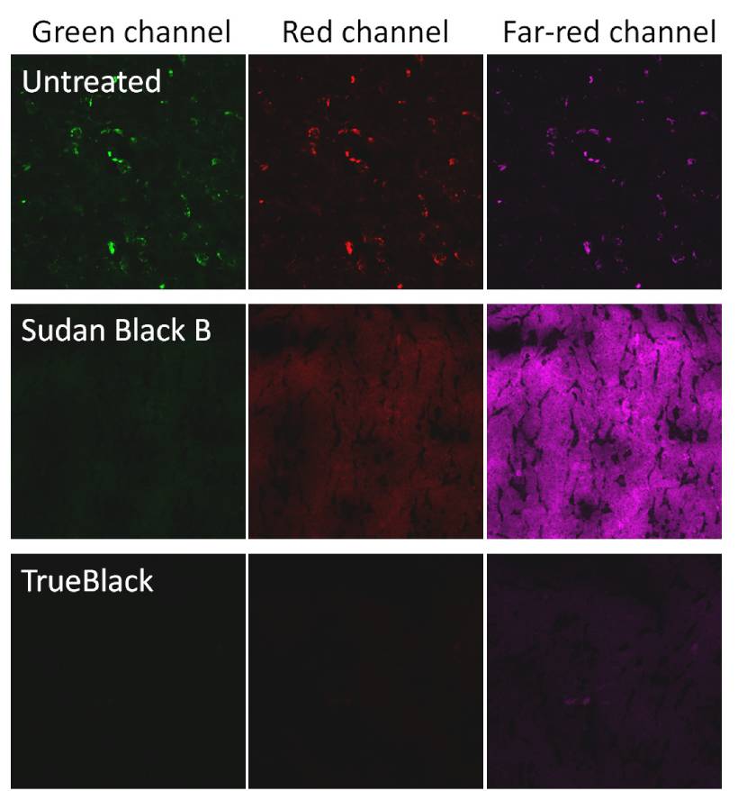 Traditionally, Sudan Black B has been used to quench lipofuscin autofluorescence. However, Sudan Black B introduces non-specific red and far-red fluorescence, limiting the use of dyes in those wavelengths. TrueBlack® Lipofuscin Autofluorescence Quencher is a superior alternative to Sudan Black B to quench autofluorescence with much lower background.
