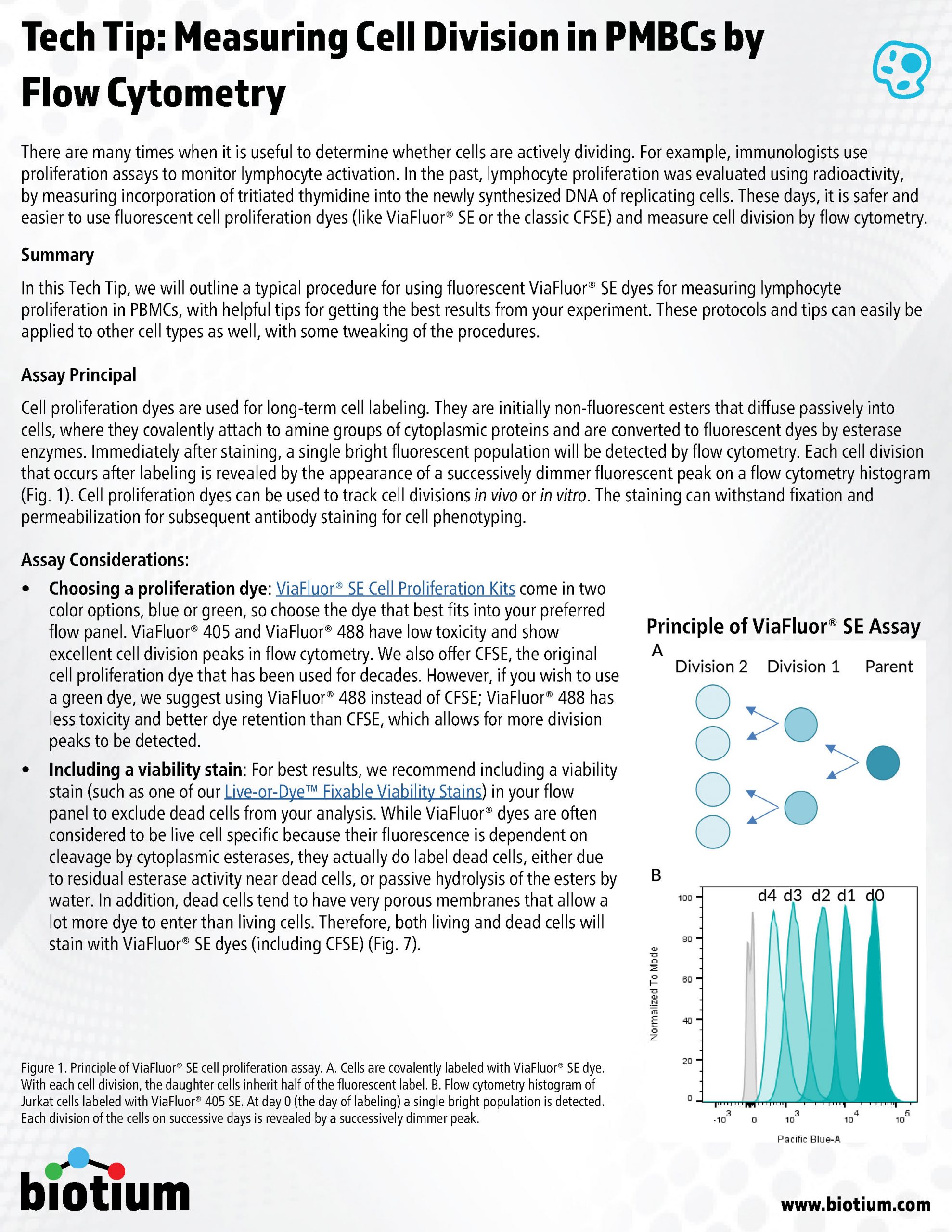 Cell proliferation of peripheral blood mononuclear cells (PMBCs) can be a useful read-out of immune cell activation. In this Tech Tip, we outline a typical procedure for using fluorescent ViaFluor® SE Dyes with PMBCs, which can easily be adapted for use with other cell types.