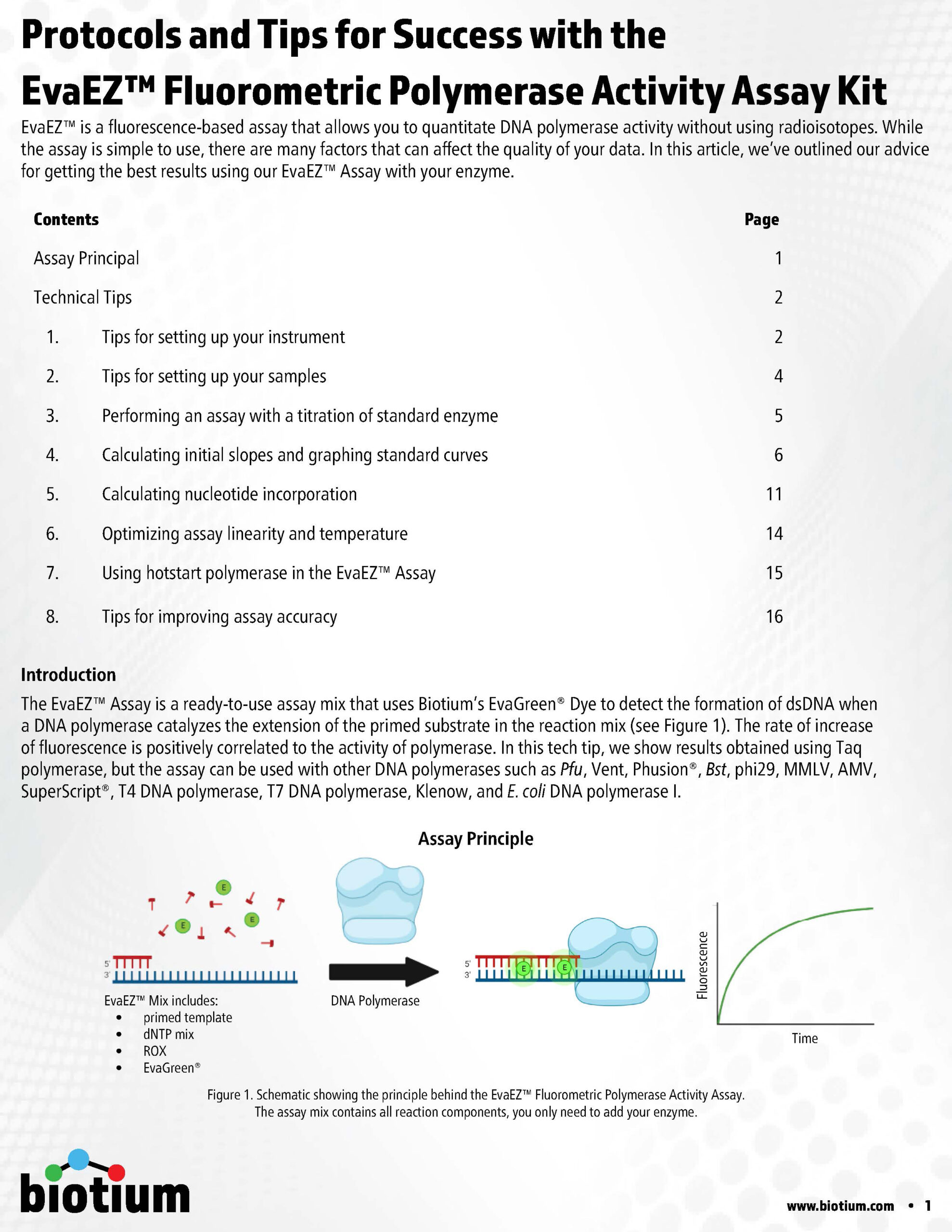 EvaEZ™ is a fluorescence-based assay that allows you to quantitate DNA polymerase activity without using radioisotopes. While the assay is simple to use, there are many factors that can affect the quality of your data. In this article, we’ve outlined our advice for getting the best results using our EvaEZ™ Assay with your enzyme.